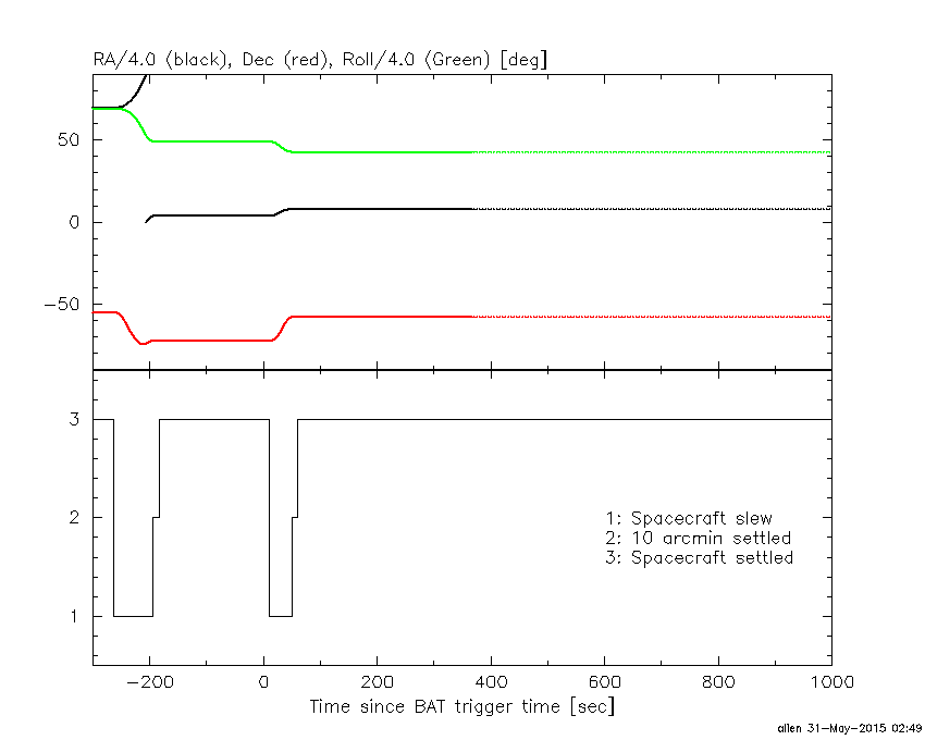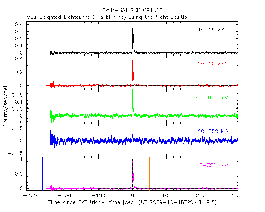 - 4) The verticle lines correspond to following: green dotted lines are T50 interval, black dotted lines are T90 interval, blue solid line(s) is a spacecraft slew start time, and orange solid line(s) is a spacecraft slew end time.