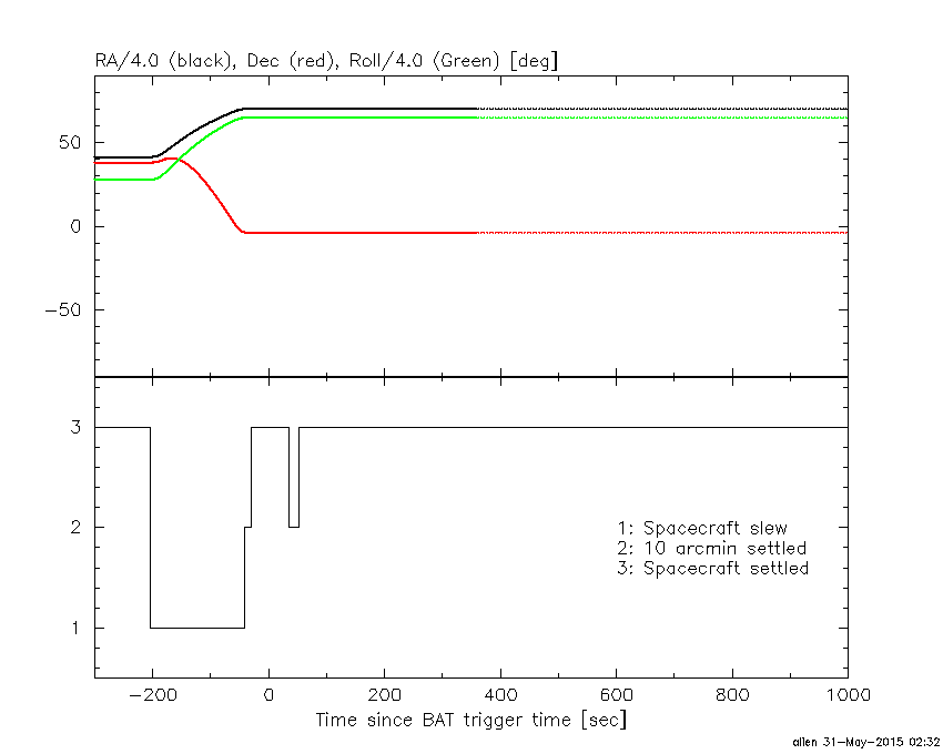 - 4) The verticle lines correspond to following: green dotted lines are T50 interval, black dotted lines are T90 interval, blue solid line(s) is a spacecraft slew start time, and orange solid line(s) is a spacecraft slew end time.