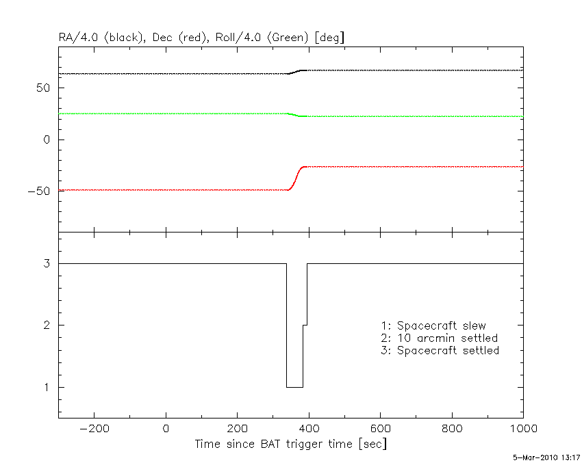 - 4) The verticle lines correspond to following: green dotted lines are T50 interval, black dotted lines are T90 interval, blue solid line(s) is a spacecraft slew start time, and orange solid line(s) is a spacecraft slew end time.
