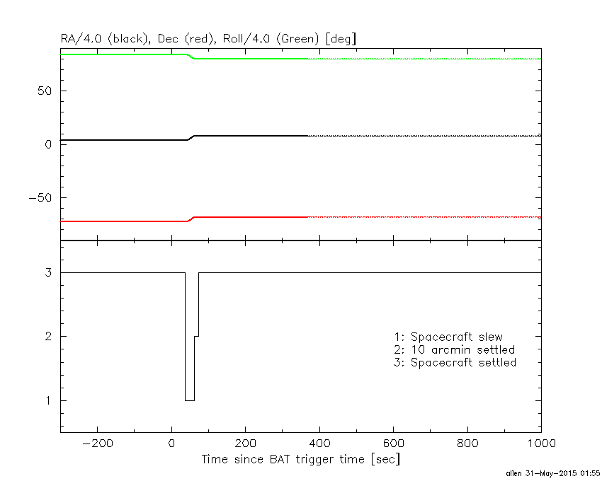 - 4) The verticle lines correspond to following: green dotted lines are T50 interval, black dotted lines are T90 interval, blue solid line(s) is a spacecraft slew start time, and orange solid line(s) is a spacecraft slew end time.