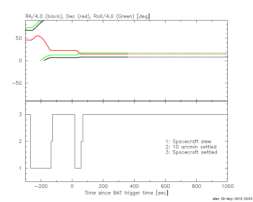 - 4) The verticle lines correspond to following: green dotted lines are T50 interval, black dotted lines are T90 interval, blue solid line(s) is a spacecraft slew start time, and orange solid line(s) is a spacecraft slew end time.