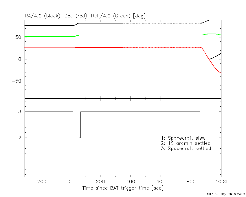 - 4) The verticle lines correspond to following: green dotted lines are T50 interval, black dotted lines are T90 interval, blue solid line(s) is a spacecraft slew start time, and orange solid line(s) is a spacecraft slew end time.