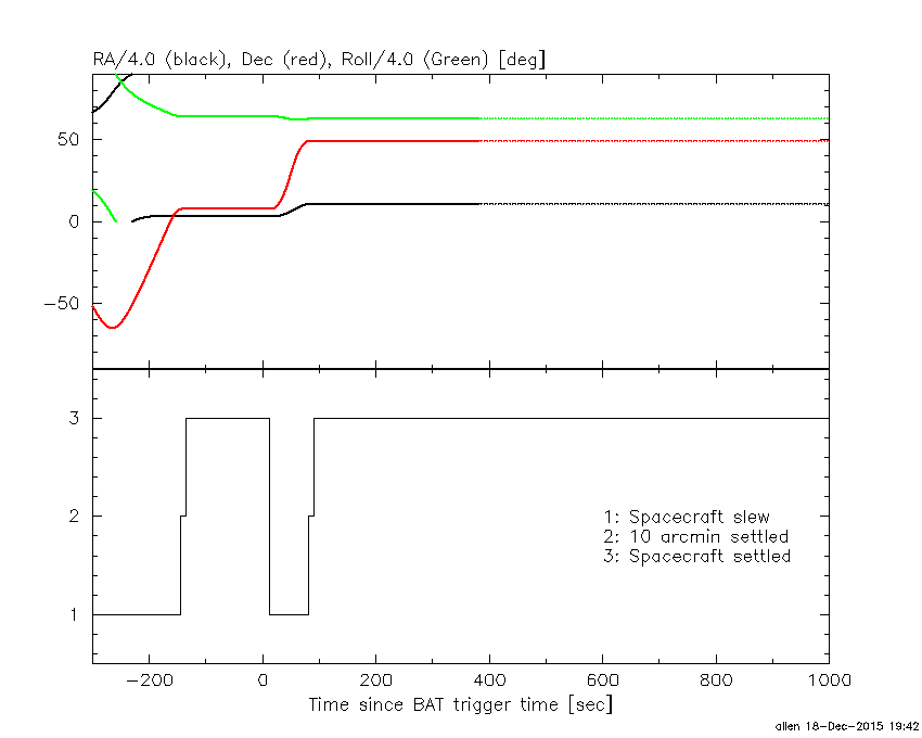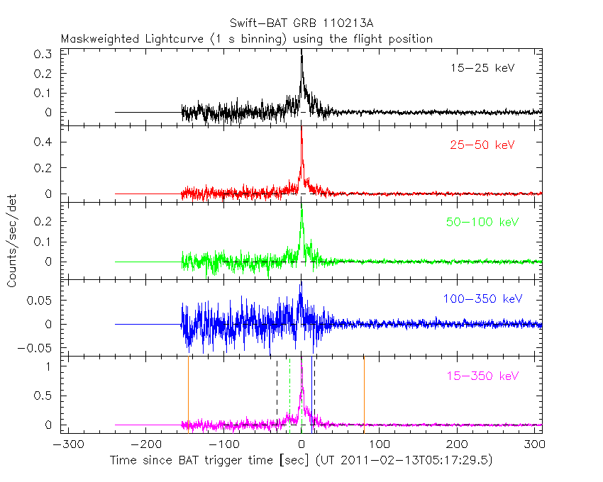 - 5) The verticle lines correspond to following: green dotted lines are T50 interval, black dotted lines are T90 interval, blue solid line(s) is a spacecraft slew start time, and orange solid line(s) is a spacecraft slew end time.