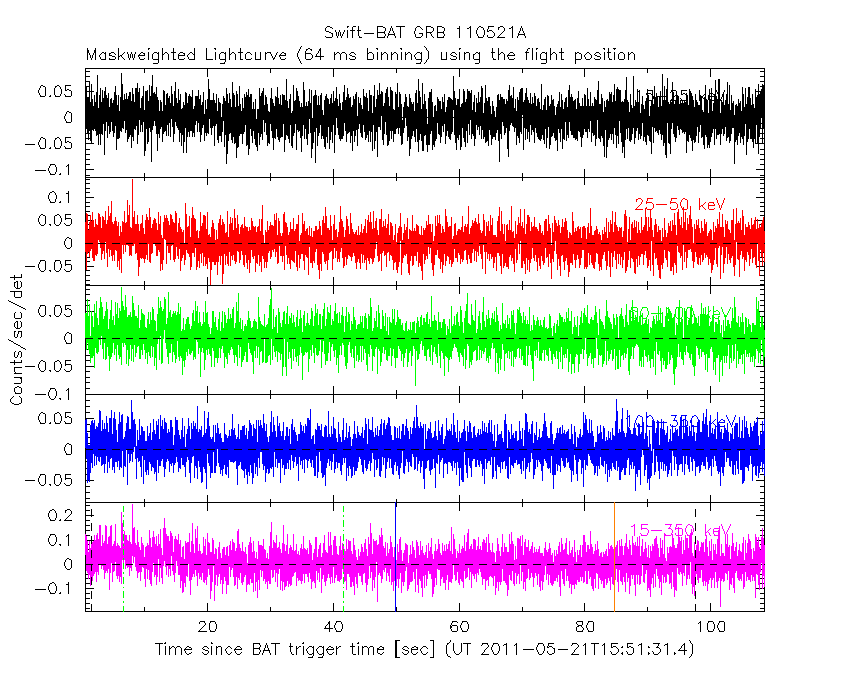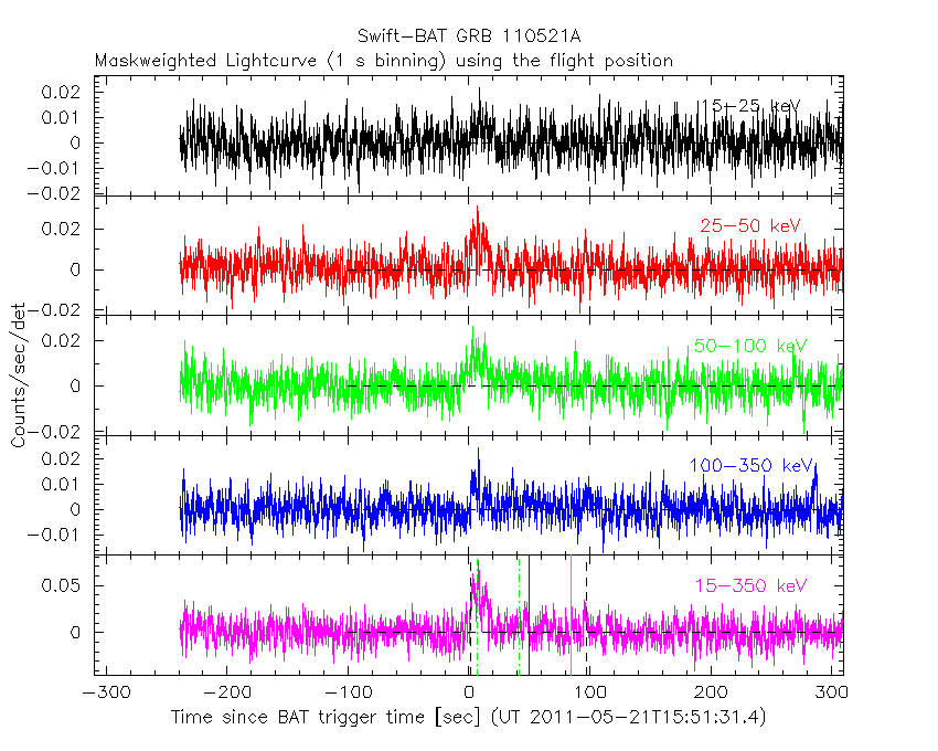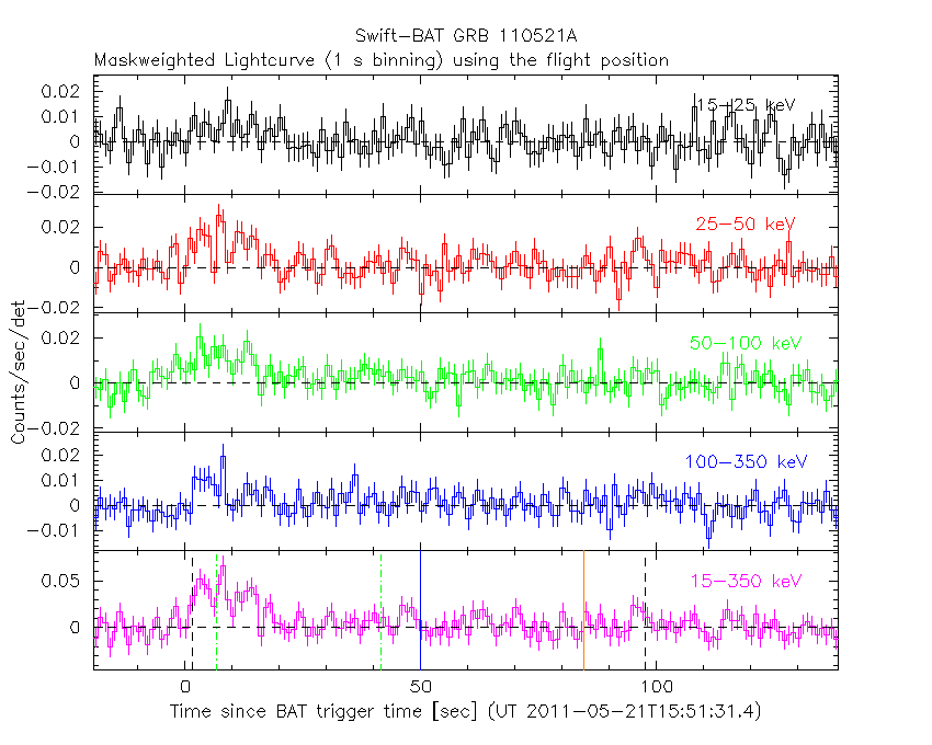 - 4) The verticle lines correspond to following: green dotted lines are T50 interval, black dotted lines are T90 interval, blue solid line(s) is a spacecraft slew start time, and orange solid line(s) is a spacecraft slew end time.