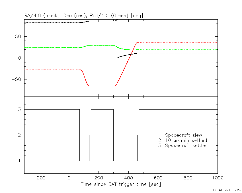 - 5) The verticle lines correspond to following: green dotted lines are T50 interval, black dotted lines are T90 interval, blue solid line(s) is a spacecraft slew start time, and orange solid line(s) is a spacecraft slew end time.