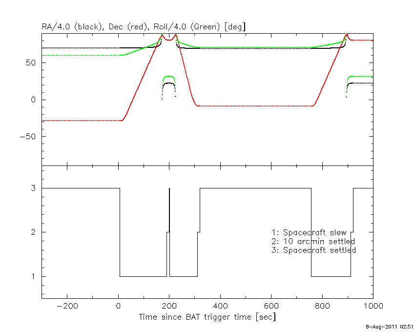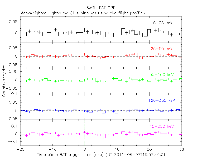 - 5) The verticle lines correspond to following: green dotted lines are T50 interval, black dotted lines are T90 interval, blue solid line(s) is a spacecraft slew start time, and orange solid line(s) is a spacecraft slew end time.