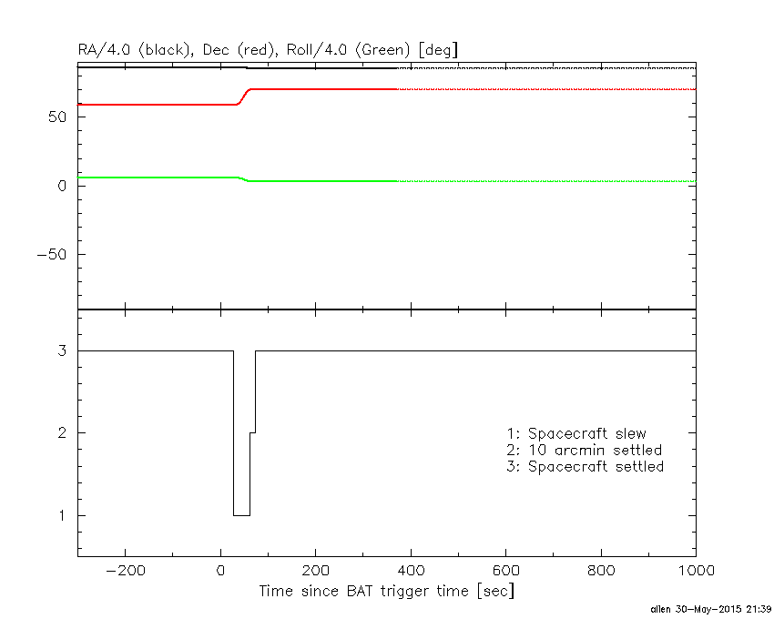 - 4) The verticle lines correspond to following: green dotted lines are T50 interval, black dotted lines are T90 interval, blue solid line(s) is a spacecraft slew start time, and orange solid line(s) is a spacecraft slew end time.