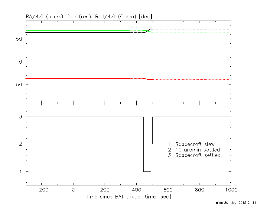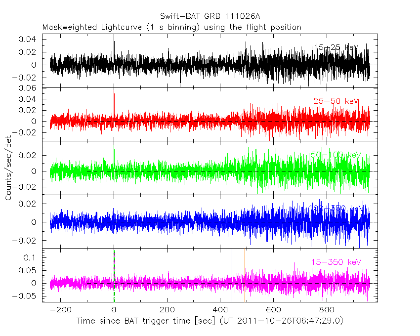 - 4) The verticle lines correspond to following: green dotted lines are T50 interval, black dotted lines are T90 interval, blue solid line(s) is a spacecraft slew start time, and orange solid line(s) is a spacecraft slew end time.