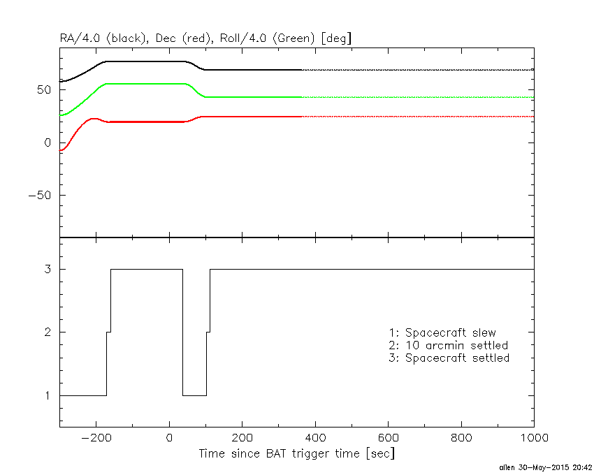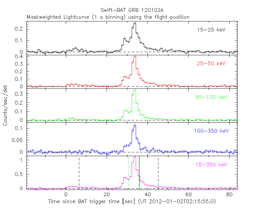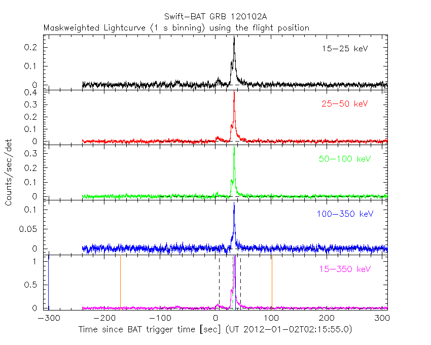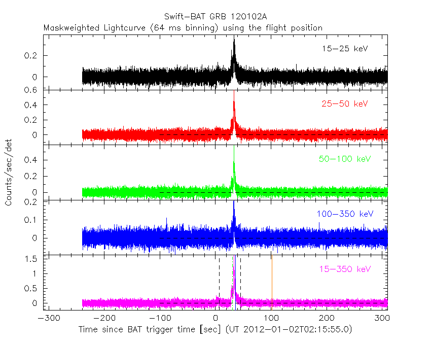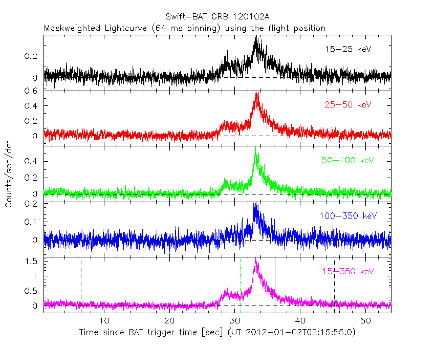 - 4) The verticle lines correspond to following: green dotted lines are T50 interval, black dotted lines are T90 interval, blue solid line(s) is a spacecraft slew start time, and orange solid line(s) is a spacecraft slew end time.