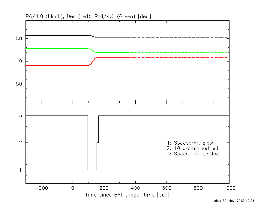- 4) The verticle lines correspond to following: green dotted lines are T50 interval, black dotted lines are T90 interval, blue solid line(s) is a spacecraft slew start time, and orange solid line(s) is a spacecraft slew end time.