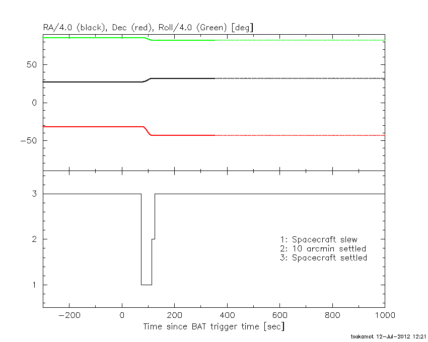 - 5) The verticle lines correspond to following: green dotted lines are T50 interval, black dotted lines are T90 interval, blue solid line(s) is a spacecraft slew start time, and orange solid line(s) is a spacecraft slew end time.