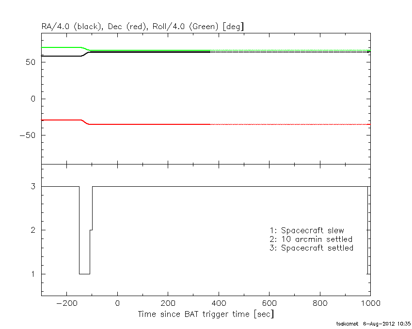 - 5) The verticle lines correspond to following: green dotted lines are T50 interval, black dotted lines are T90 interval, blue solid line(s) is a spacecraft slew start time, and orange solid line(s) is a spacecraft slew end time.