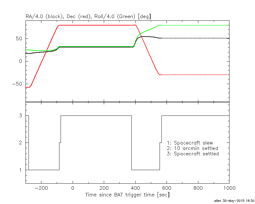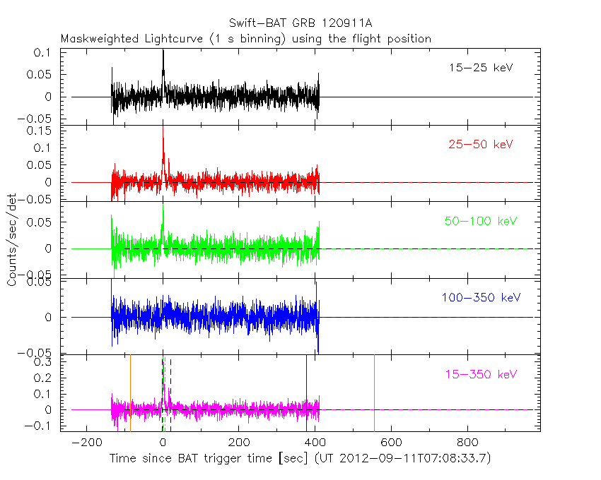 - 4) The verticle lines correspond to following: green dotted lines are T50 interval, black dotted lines are T90 interval, blue solid line(s) is a spacecraft slew start time, and orange solid line(s) is a spacecraft slew end time.
