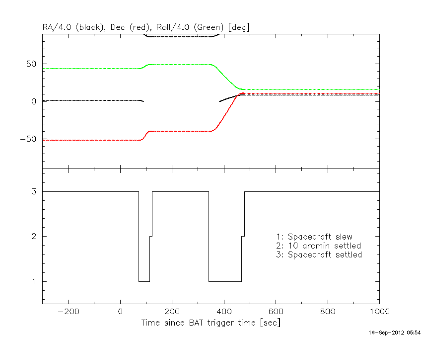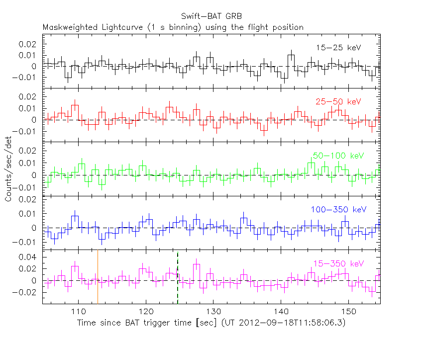 - 5) The verticle lines correspond to following: green dotted lines are T50 interval, black dotted lines are T90 interval, blue solid line(s) is a spacecraft slew start time, and orange solid line(s) is a spacecraft slew end time.