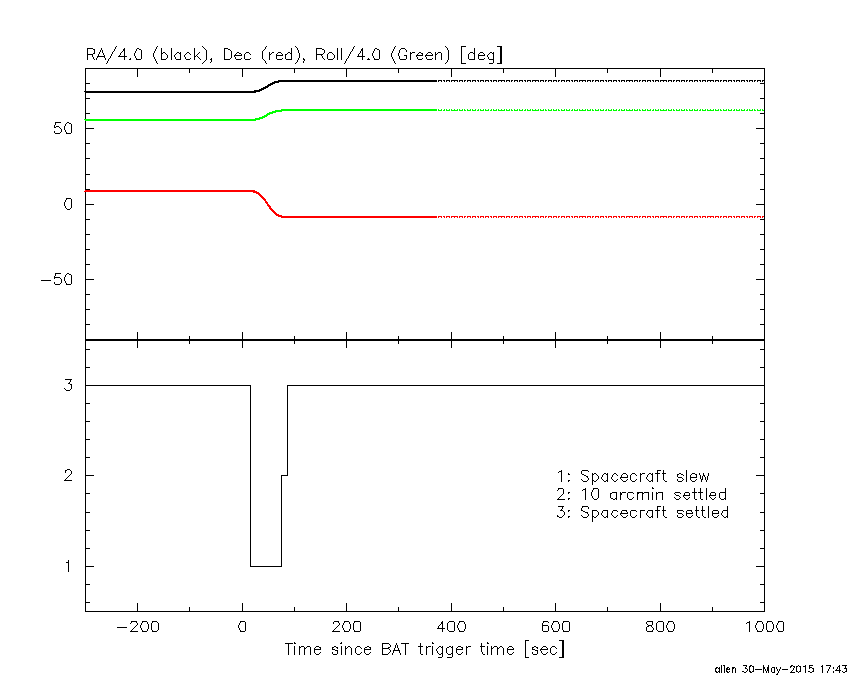 - 4) The verticle lines correspond to following: green dotted lines are T50 interval, black dotted lines are T90 interval, blue solid line(s) is a spacecraft slew start time, and orange solid line(s) is a spacecraft slew end time.