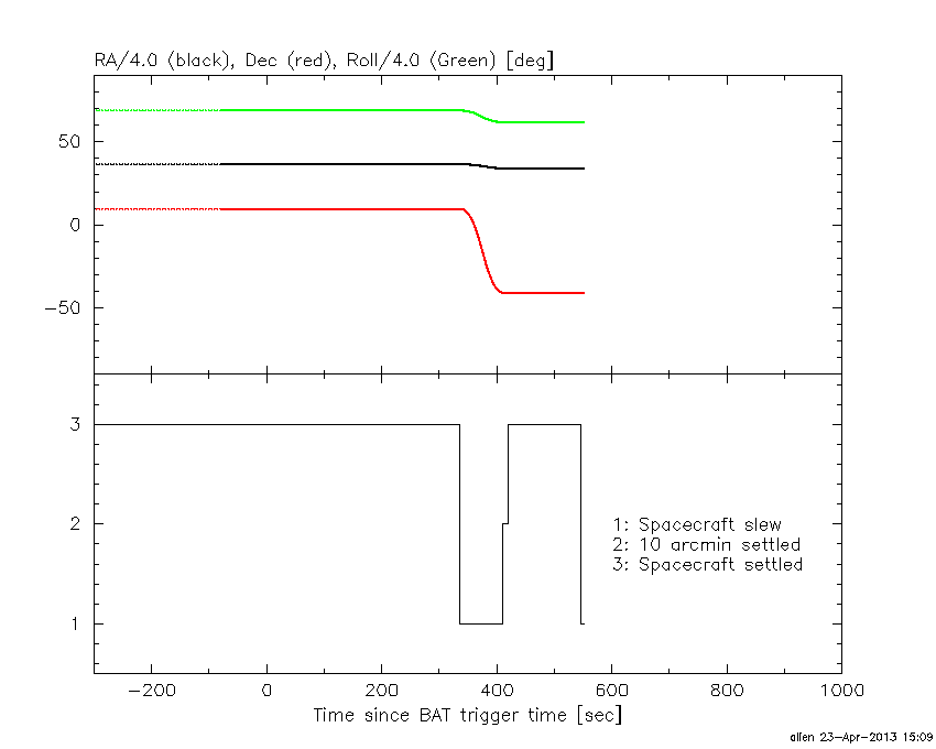 - 5) The verticle lines correspond to following: green dotted lines are T50 interval, black dotted lines are T90 interval, blue solid line(s) is a spacecraft slew start time, and orange solid line(s) is a spacecraft slew end time.