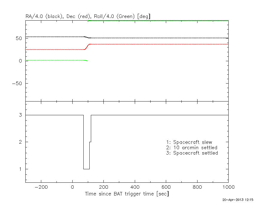- 5) The verticle lines correspond to following: green dotted lines are T50 interval, black dotted lines are T90 interval, blue solid line(s) is a spacecraft slew start time, and orange solid line(s) is a spacecraft slew end time.