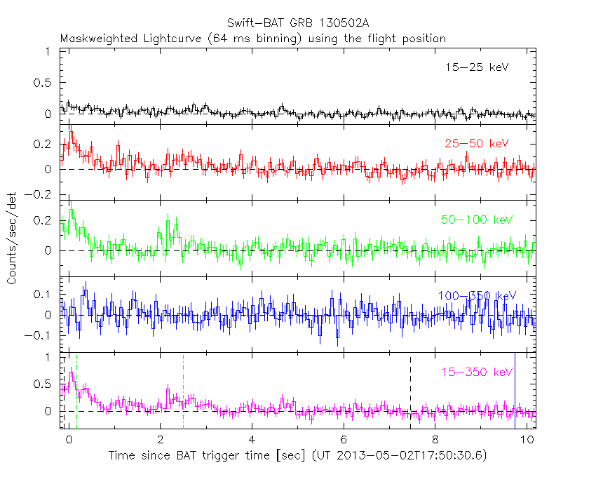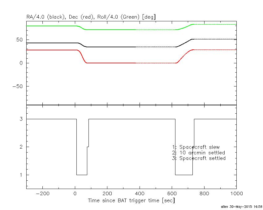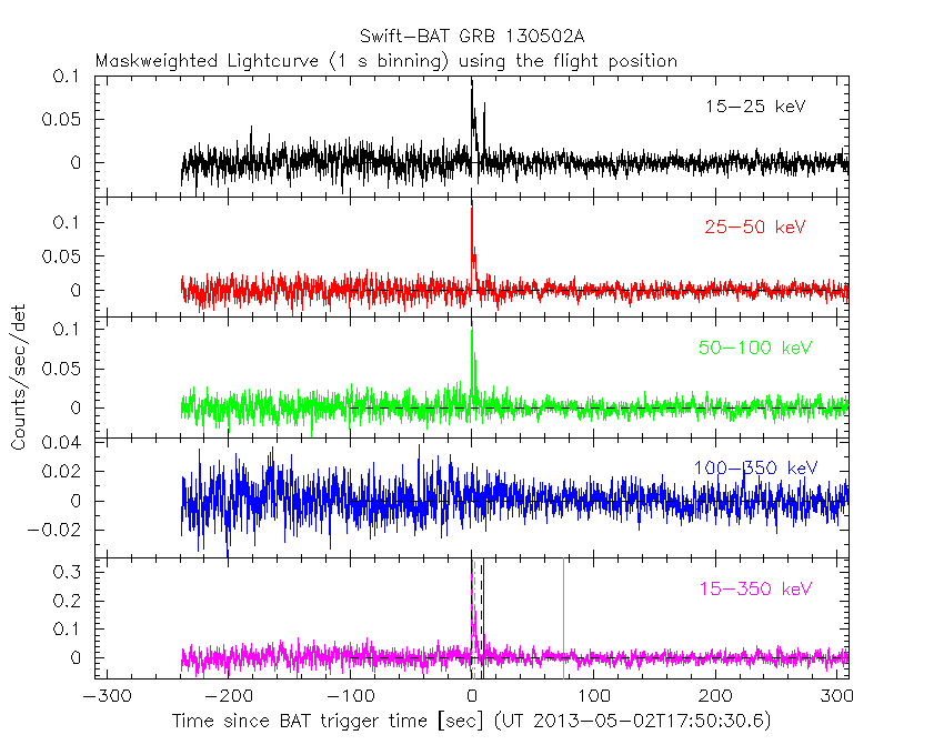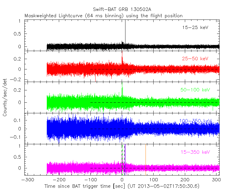 - 4) The verticle lines correspond to following: green dotted lines are T50 interval, black dotted lines are T90 interval, blue solid line(s) is a spacecraft slew start time, and orange solid line(s) is a spacecraft slew end time.