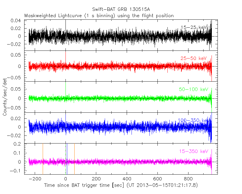 - 4) The verticle lines correspond to following: green dotted lines are T50 interval, black dotted lines are T90 interval, blue solid line(s) is a spacecraft slew start time, and orange solid line(s) is a spacecraft slew end time.