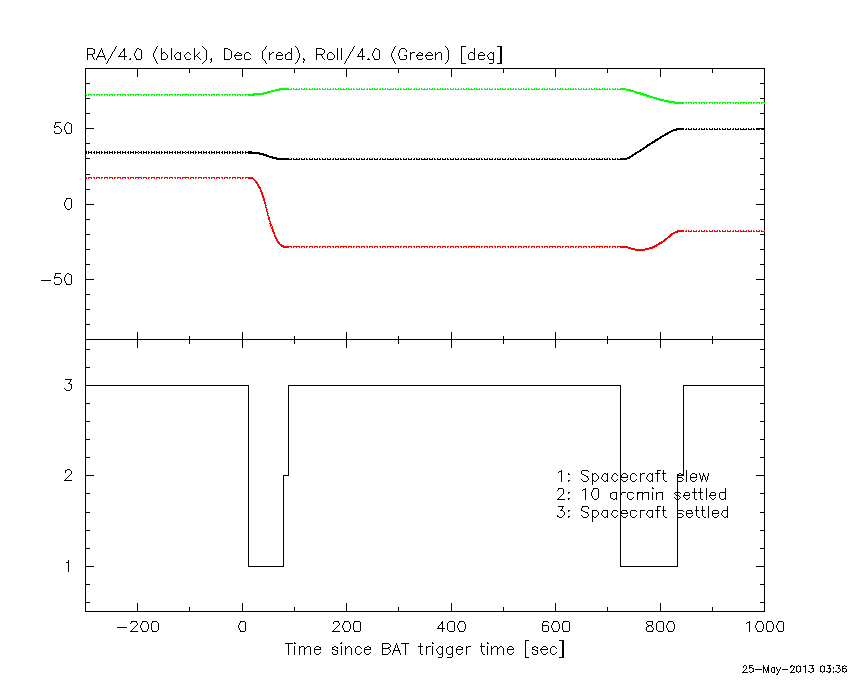 - 5) The verticle lines correspond to following: green dotted lines are T50 interval, black dotted lines are T90 interval, blue solid line(s) is a spacecraft slew start time, and orange solid line(s) is a spacecraft slew end time.