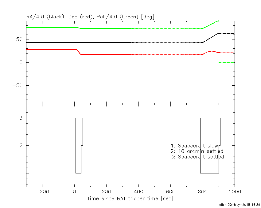 - 4) The verticle lines correspond to following: green dotted lines are T50 interval, black dotted lines are T90 interval, blue solid line(s) is a spacecraft slew start time, and orange solid line(s) is a spacecraft slew end time.