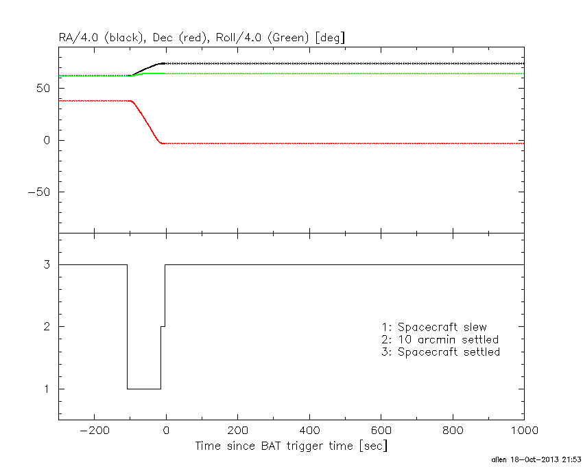 - 5) The verticle lines correspond to following: green dotted lines are T50 interval, black dotted lines are T90 interval, blue solid line(s) is a spacecraft slew start time, and orange solid line(s) is a spacecraft slew end time.