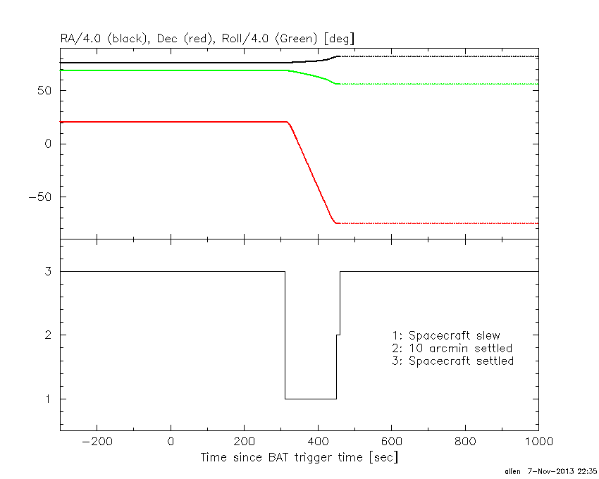 - 5) The verticle lines correspond to following: green dotted lines are T50 interval, black dotted lines are T90 interval, blue solid line(s) is a spacecraft slew start time, and orange solid line(s) is a spacecraft slew end time.