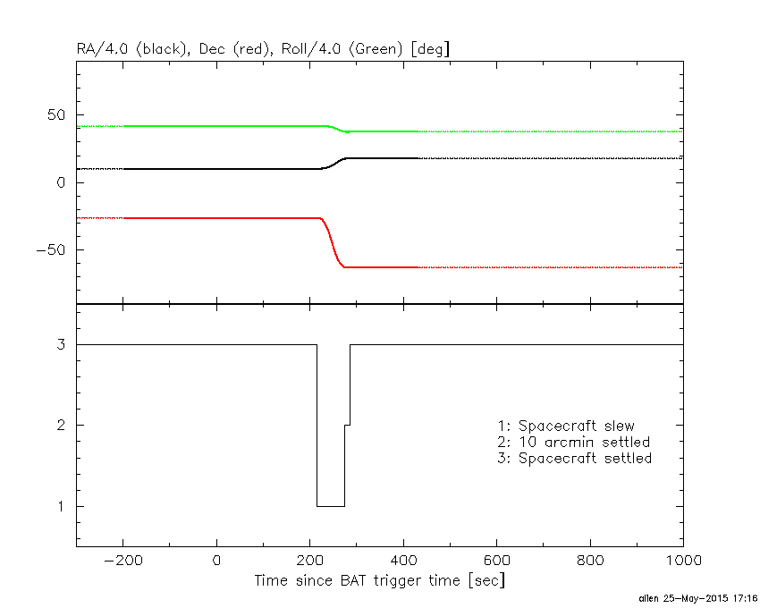 - 2) The verticle lines correspond to following: green dotted lines are T50 interval, black dotted lines are T90 interval, blue solid line(s) is a spacecraft slew start time, and orange solid line(s) is a spacecraft slew end time (for the best duration plot, slew times are marked by green arrows).