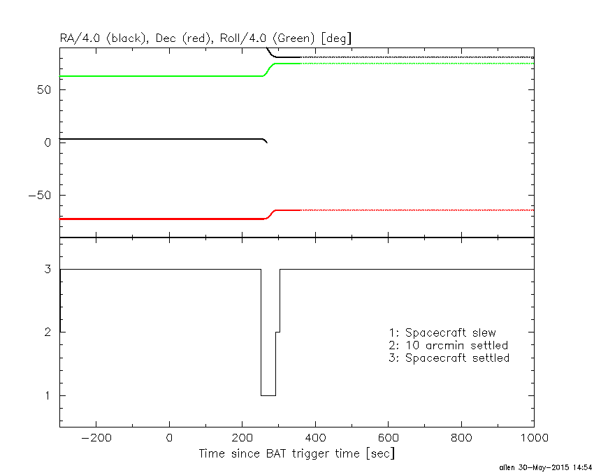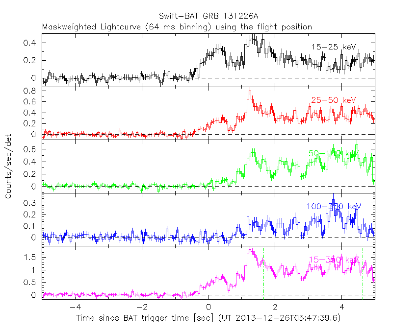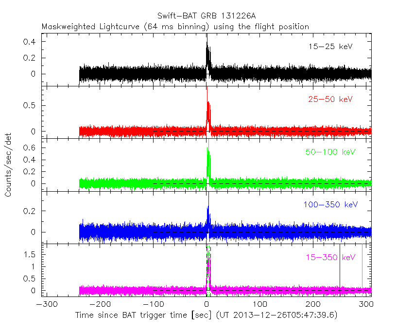 - 4) The verticle lines correspond to following: green dotted lines are T50 interval, black dotted lines are T90 interval, blue solid line(s) is a spacecraft slew start time, and orange solid line(s) is a spacecraft slew end time.