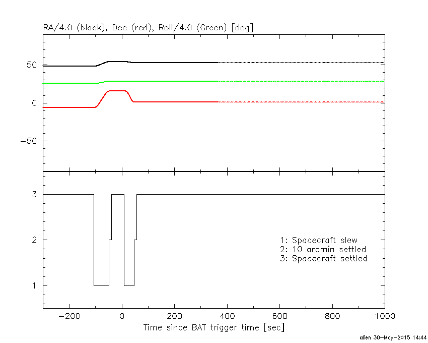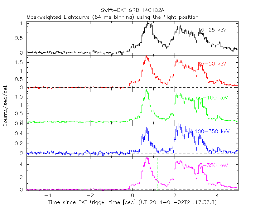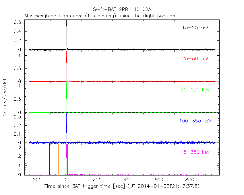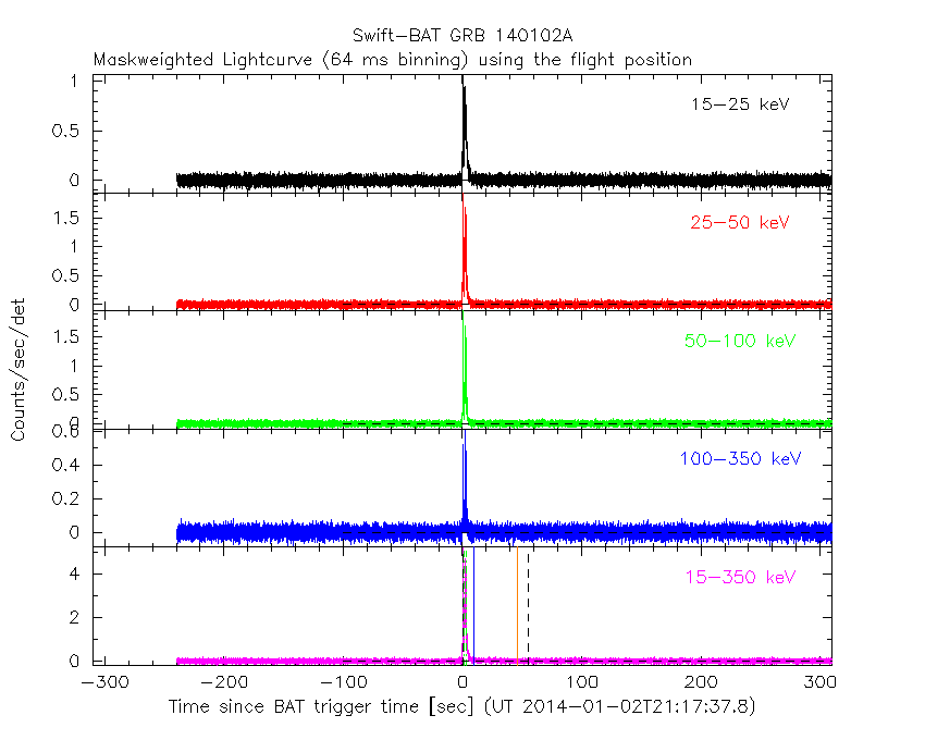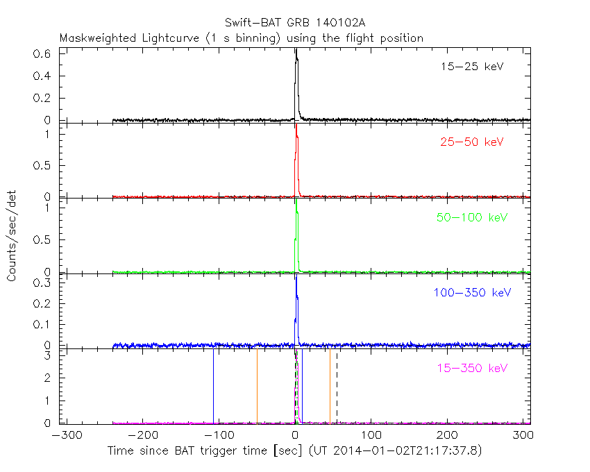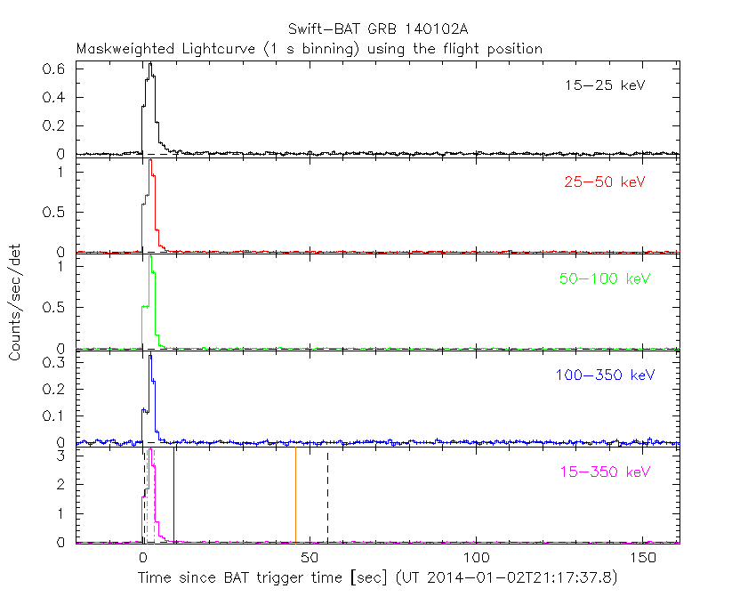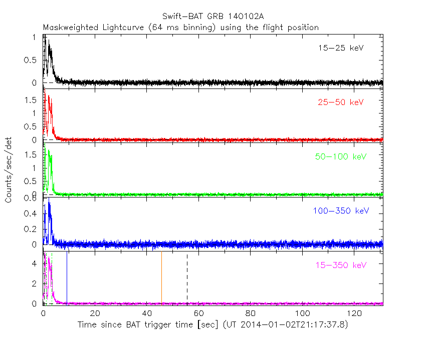- 4) The verticle lines correspond to following: green dotted lines are T50 interval, black dotted lines are T90 interval, blue solid line(s) is a spacecraft slew start time, and orange solid line(s) is a spacecraft slew end time.