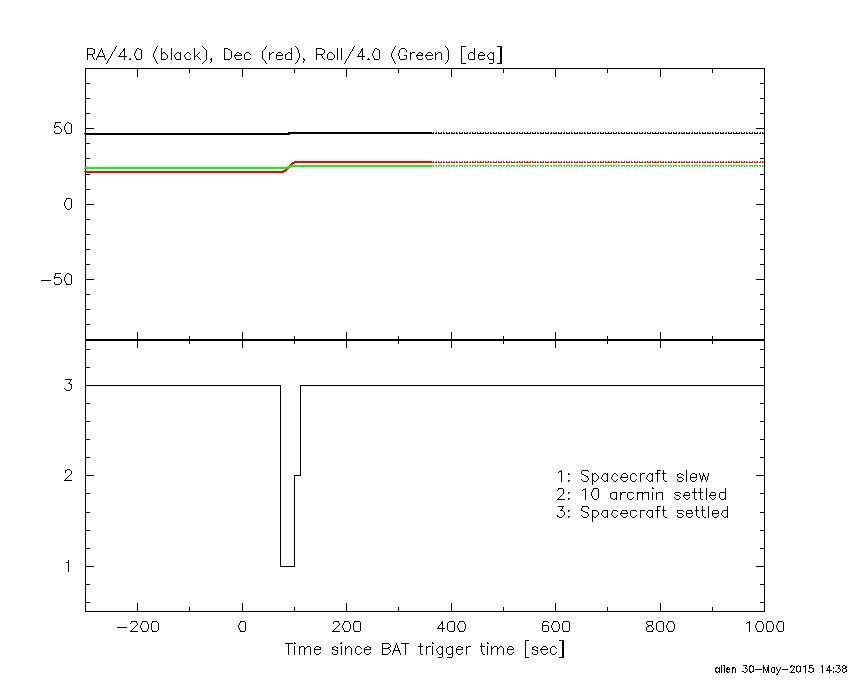 - 4) The verticle lines correspond to following: green dotted lines are T50 interval, black dotted lines are T90 interval, blue solid line(s) is a spacecraft slew start time, and orange solid line(s) is a spacecraft slew end time.