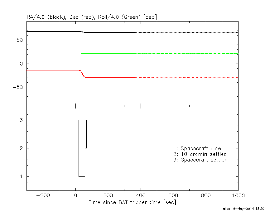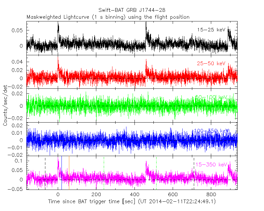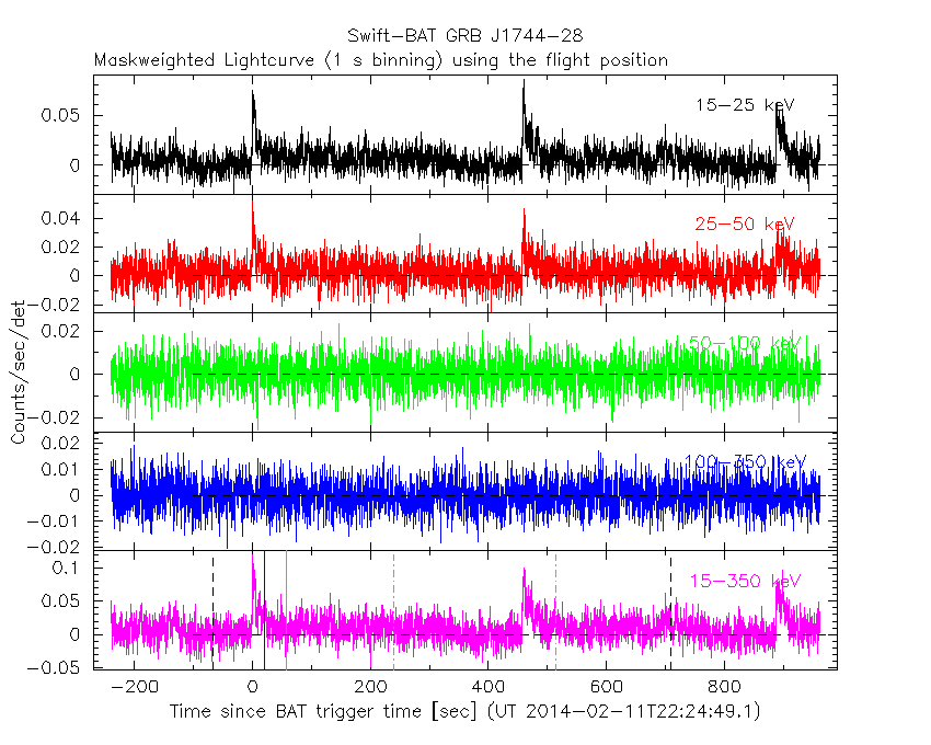 - 5) The verticle lines correspond to following: green dotted lines are T50 interval, black dotted lines are T90 interval, blue solid line(s) is a spacecraft slew start time, and orange solid line(s) is a spacecraft slew end time.