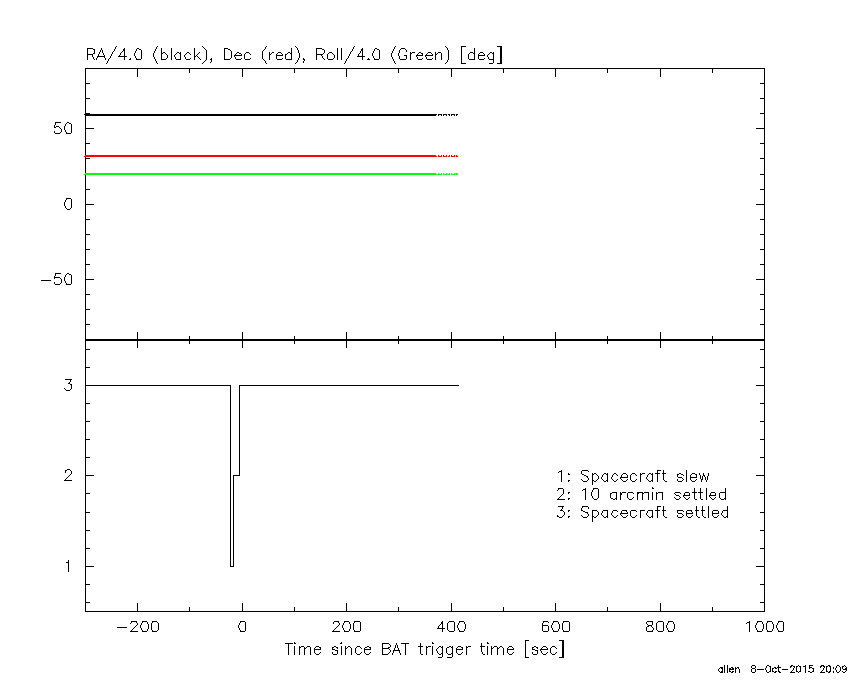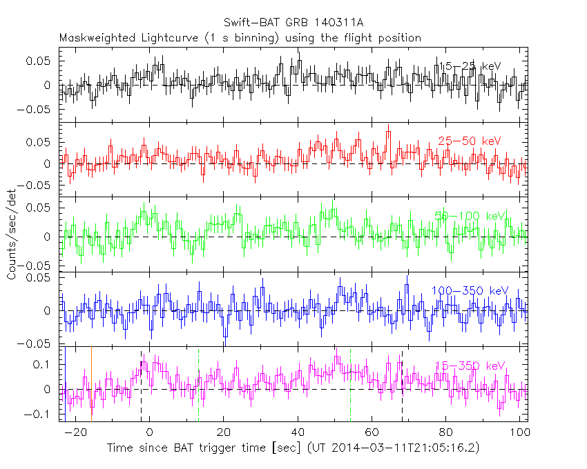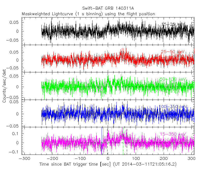- 4) The verticle lines correspond to following: green dotted lines are T50 interval, black dotted lines are T90 interval, blue solid line(s) is a spacecraft slew start time, and orange solid line(s) is a spacecraft slew end time.