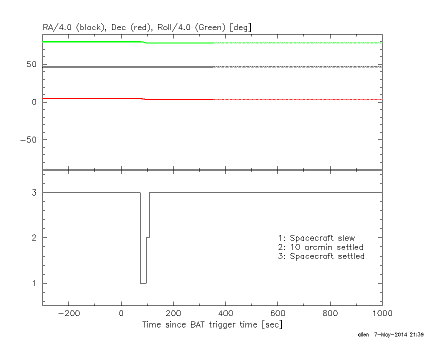 - 5) The verticle lines correspond to following: green dotted lines are T50 interval, black dotted lines are T90 interval, blue solid line(s) is a spacecraft slew start time, and orange solid line(s) is a spacecraft slew end time.