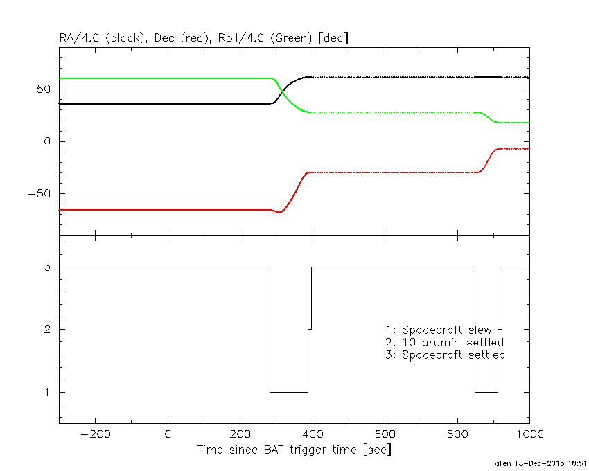 - 5) The verticle lines correspond to following: green dotted lines are T50 interval, black dotted lines are T90 interval, blue solid line(s) is a spacecraft slew start time, and orange solid line(s) is a spacecraft slew end time.