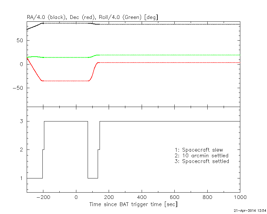 - 5) The verticle lines correspond to following: green dotted lines are T50 interval, black dotted lines are T90 interval, blue solid line(s) is a spacecraft slew start time, and orange solid line(s) is a spacecraft slew end time.
