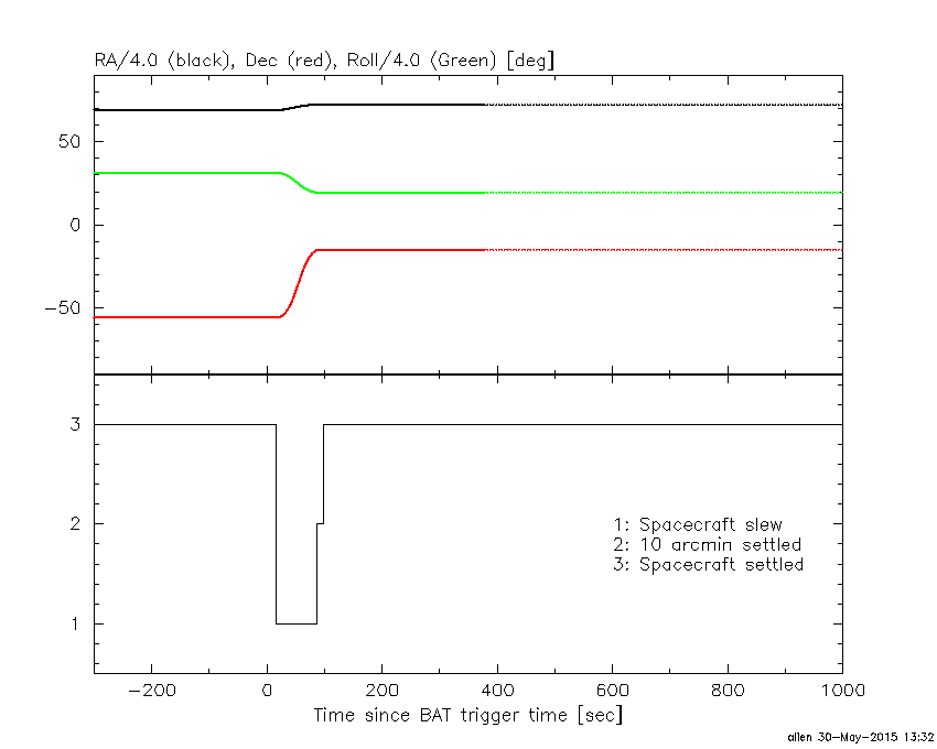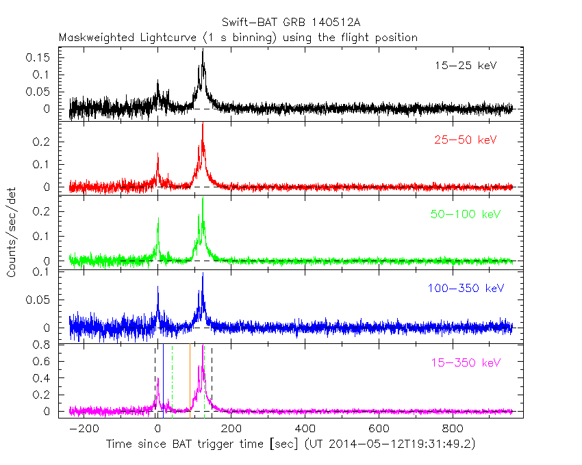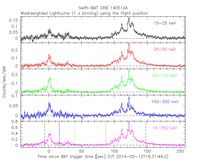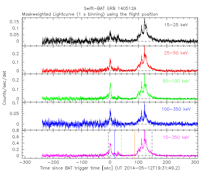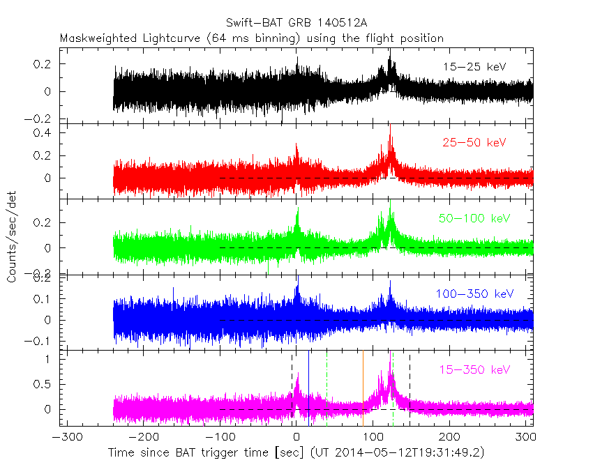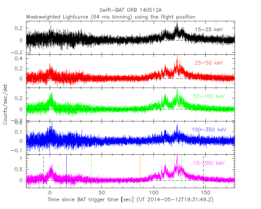 - 4) The verticle lines correspond to following: green dotted lines are T50 interval, black dotted lines are T90 interval, blue solid line(s) is a spacecraft slew start time, and orange solid line(s) is a spacecraft slew end time.