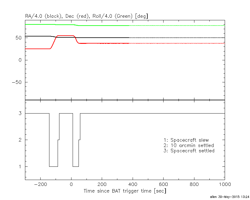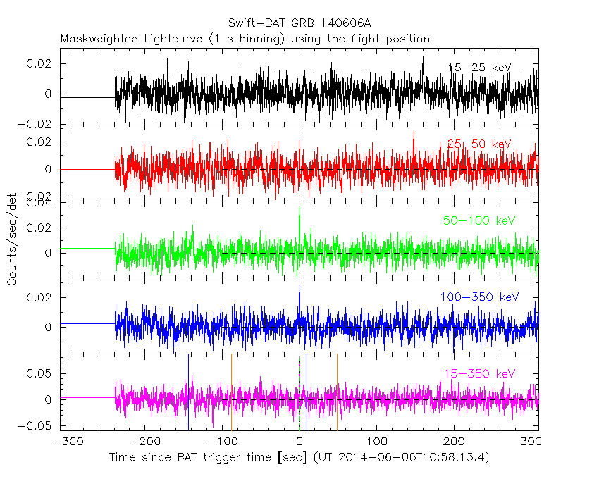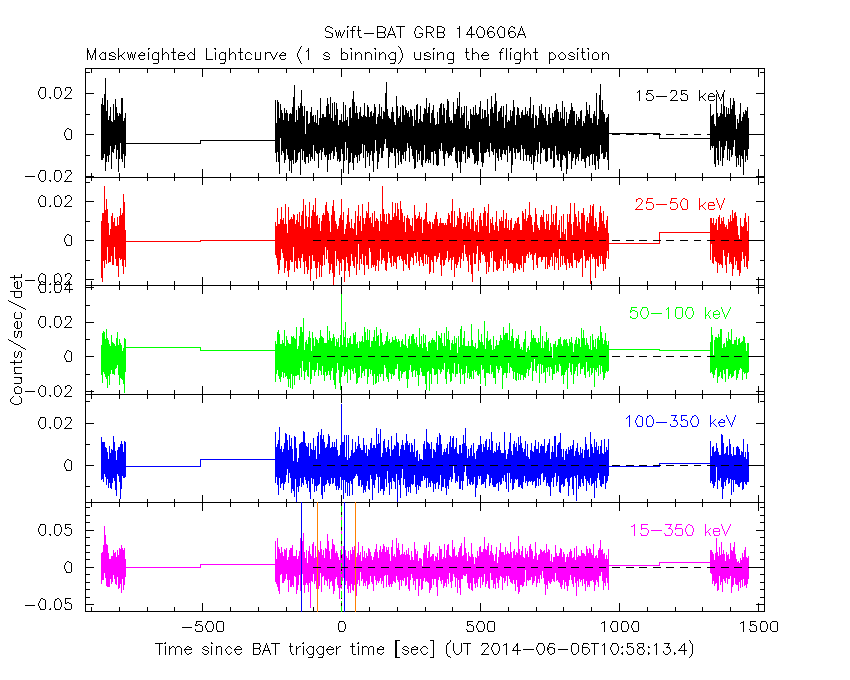 - 4) The verticle lines correspond to following: green dotted lines are T50 interval, black dotted lines are T90 interval, blue solid line(s) is a spacecraft slew start time, and orange solid line(s) is a spacecraft slew end time.