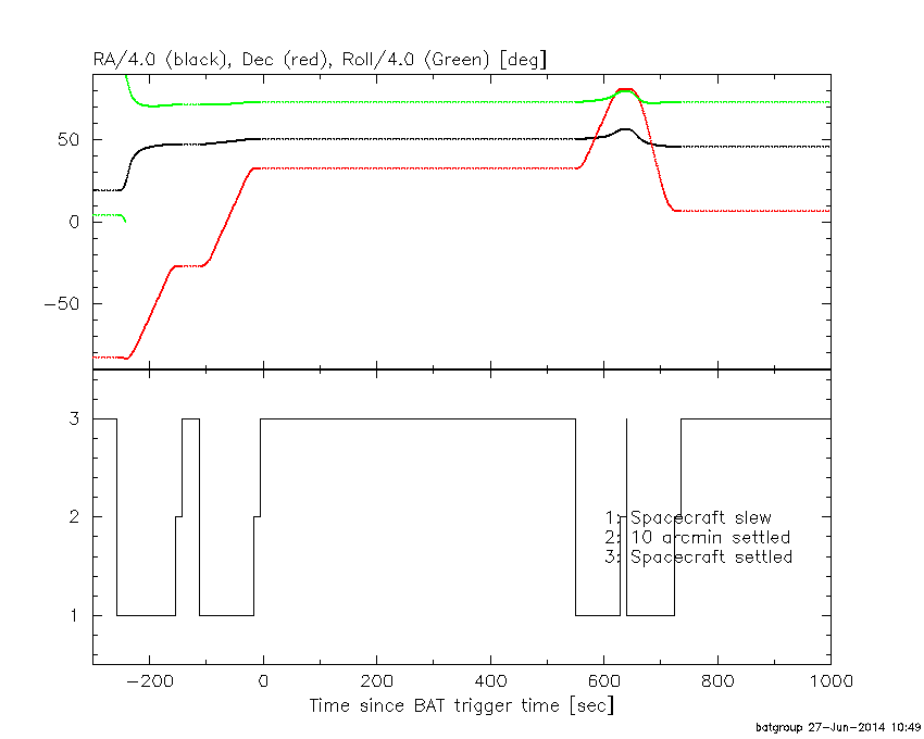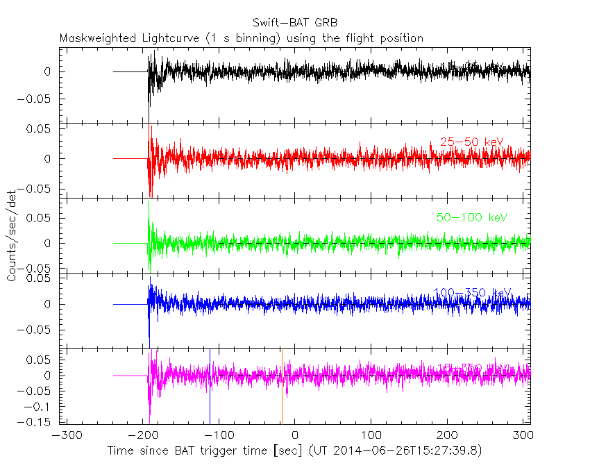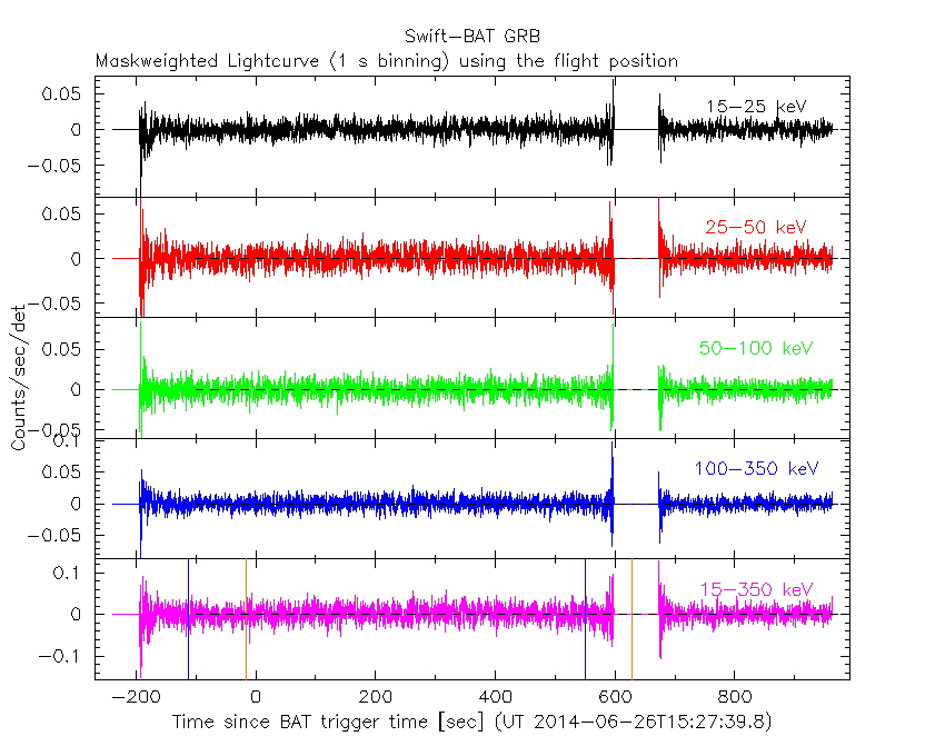 - 5) The verticle lines correspond to following: green dotted lines are T50 interval, black dotted lines are T90 interval, blue solid line(s) is a spacecraft slew start time, and orange solid line(s) is a spacecraft slew end time.