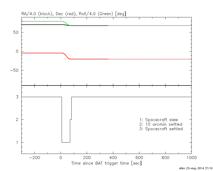 - 5) The verticle lines correspond to following: green dotted lines are T50 interval, black dotted lines are T90 interval, blue solid line(s) is a spacecraft slew start time, and orange solid line(s) is a spacecraft slew end time.