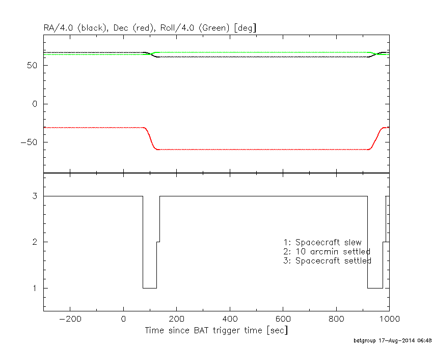 - 5) The verticle lines correspond to following: green dotted lines are T50 interval, black dotted lines are T90 interval, blue solid line(s) is a spacecraft slew start time, and orange solid line(s) is a spacecraft slew end time.