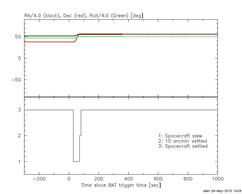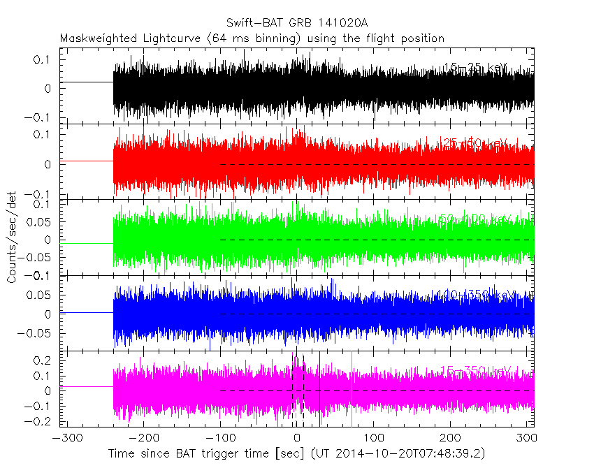 - 4) The verticle lines correspond to following: green dotted lines are T50 interval, black dotted lines are T90 interval, blue solid line(s) is a spacecraft slew start time, and orange solid line(s) is a spacecraft slew end time.