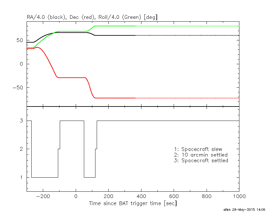 - 4) The verticle lines correspond to following: green dotted lines are T50 interval, black dotted lines are T90 interval, blue solid line(s) is a spacecraft slew start time, and orange solid line(s) is a spacecraft slew end time.