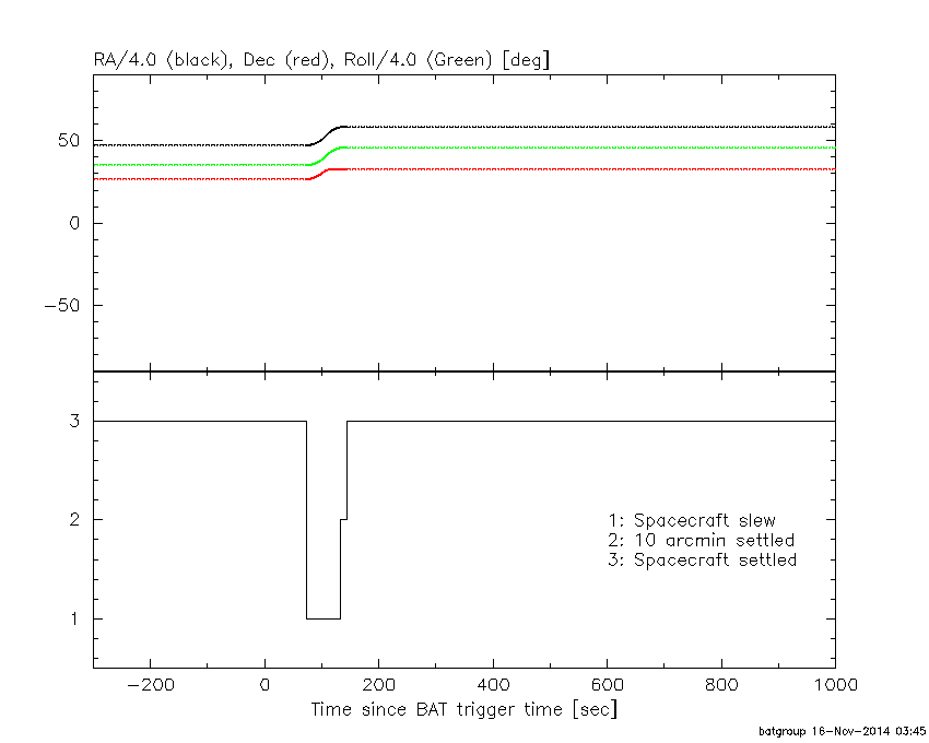 - 5) The verticle lines correspond to following: green dotted lines are T50 interval, black dotted lines are T90 interval, blue solid line(s) is a spacecraft slew start time, and orange solid line(s) is a spacecraft slew end time.