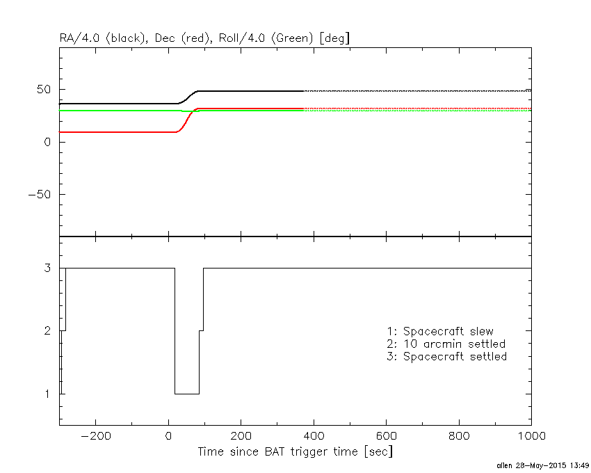 - 4) The verticle lines correspond to following: green dotted lines are T50 interval, black dotted lines are T90 interval, blue solid line(s) is a spacecraft slew start time, and orange solid line(s) is a spacecraft slew end time.