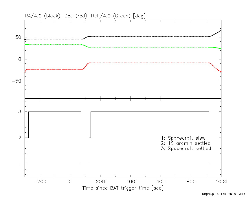 - 5) The verticle lines correspond to following: green dotted lines are T50 interval, black dotted lines are T90 interval, blue solid line(s) is a spacecraft slew start time, and orange solid line(s) is a spacecraft slew end time.