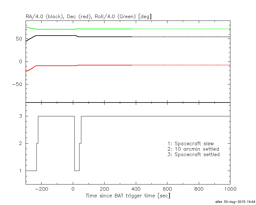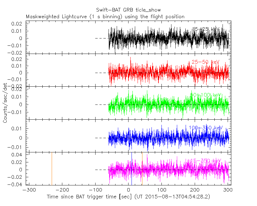 - 5) The verticle lines correspond to following: green dotted lines are T50 interval, black dotted lines are T90 interval, blue solid line(s) is a spacecraft slew start time, and orange solid line(s) is a spacecraft slew end time.