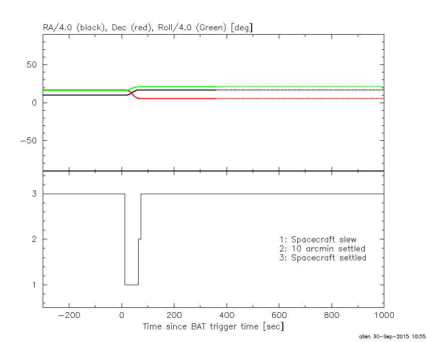 - 4) The verticle lines correspond to following: green dotted lines are T50 interval, black dotted lines are T90 interval, blue solid line(s) is a spacecraft slew start time, and orange solid line(s) is a spacecraft slew end time.