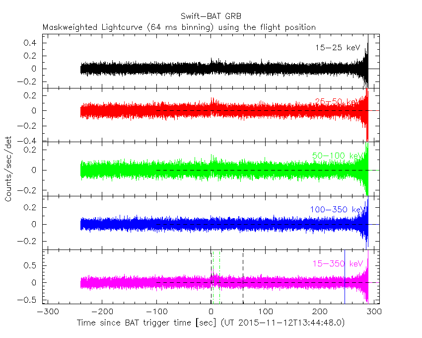 - 4) The verticle lines correspond to following: green dotted lines are T50 interval, black dotted lines are T90 interval, blue solid line(s) is a spacecraft slew start time, and orange solid line(s) is a spacecraft slew end time.