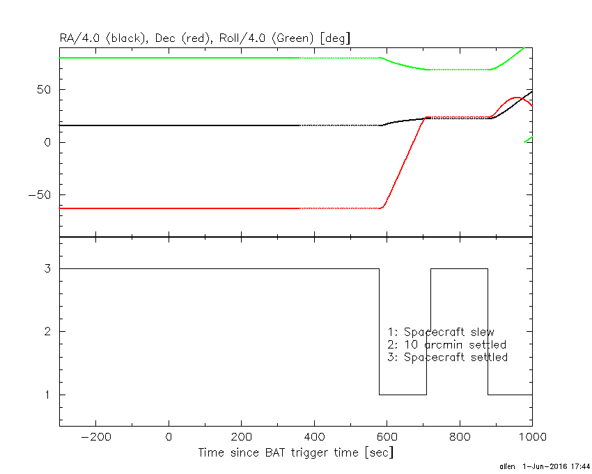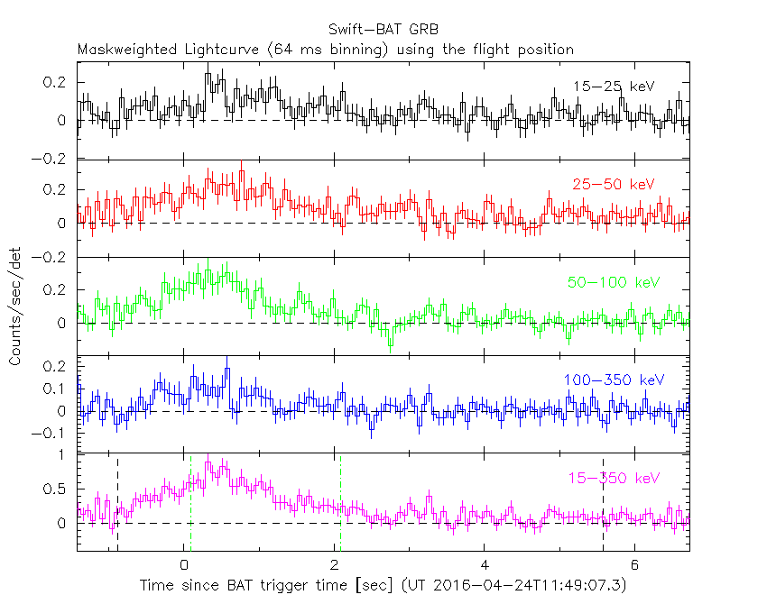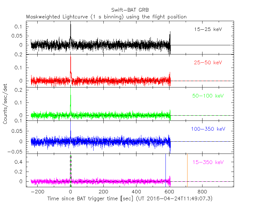 - 4) The verticle lines correspond to following: green dotted lines are T50 interval, black dotted lines are T90 interval, blue solid line(s) is a spacecraft slew start time, and orange solid line(s) is a spacecraft slew end time.